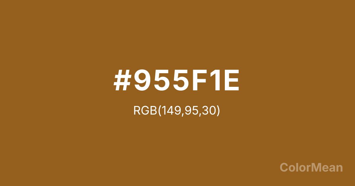 #955F1E RGB value is (149, 95, 30). The hex color red value is 149, green is 95, and blue is 30. Its HSL format shows a hue of 33°, saturation of 66 percent, and lightness of 35 percent. The CMYK process values are 0 percent, 36 percent, 80 percent, 42 percent.