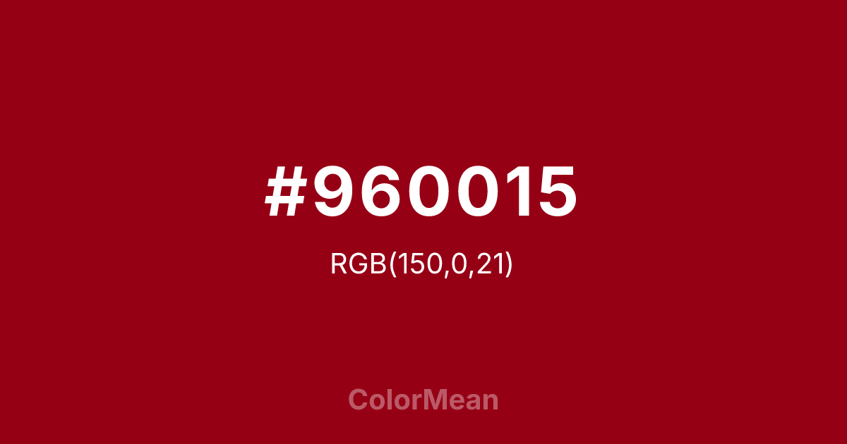 #960015 RGB value is (150, 0, 21). The hex color red value is 150, green is 0, and blue is 21. Its HSL format shows a hue of 352°, saturation of 100 percent, and lightness of 29 percent. The CMYK process values are 0 percent, 100 percent, 86 percent, 41 percent.