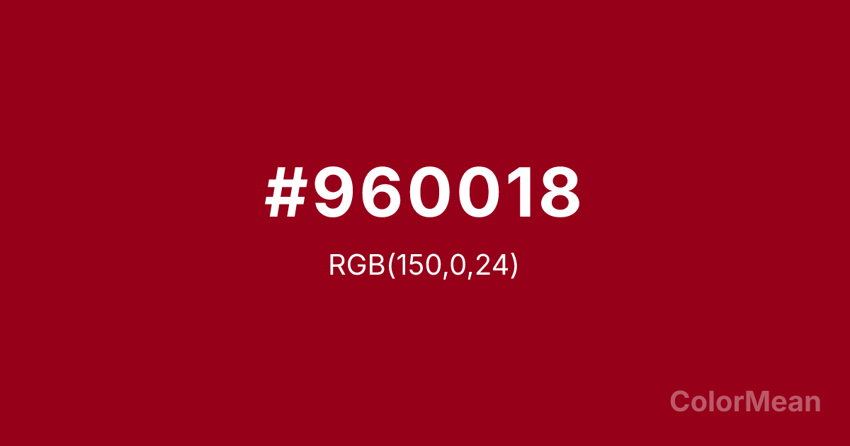Carmine (#960018) RGB value is (150, 0, 24). The hex color red value is 150, green is 0, and blue is 24. Its HSL format shows a hue of 350°, saturation of 100 percent, and lightness of 29 percent. The CMYK process values are 0 percent, 100 percent, 84 percent, 41 percent.