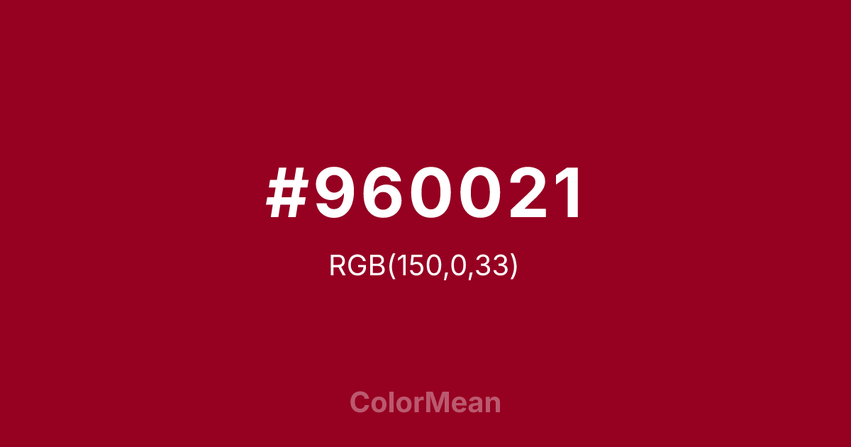 #960021 RGB value is (150, 0, 33). The hex color red value is 150, green is 0, and blue is 33. Its HSL format shows a hue of 347°, saturation of 100 percent, and lightness of 29 percent. The CMYK process values are 0 percent, 100 percent, 78 percent, 41 percent.