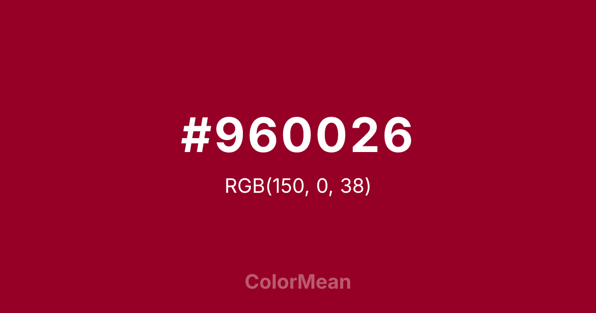 #960026 RGB value is (150, 0, 38). The hex color red value is 150, green is 0, and blue is 38. Its HSL format shows a hue of 345°, saturation of 100 percent, and lightness of 29 percent. The CMYK process values are 0 percent, 100 percent, 75 percent, 41 percent.