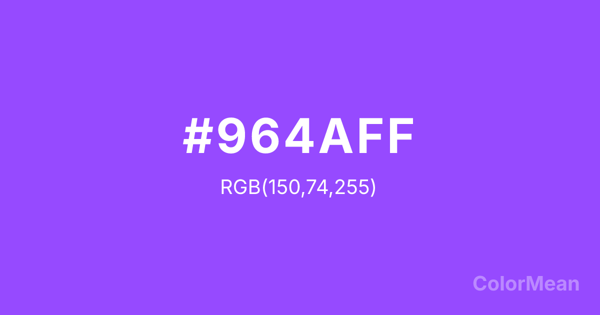 #964AFF RGB value is (150, 74, 255). The hex color red value is 150, green is 74, and blue is 255. Its HSL format shows a hue of 265°, saturation of 100 percent, and lightness of 65 percent. The CMYK process values are 41 percent, 71 percent, 0 percent, 0 percent.