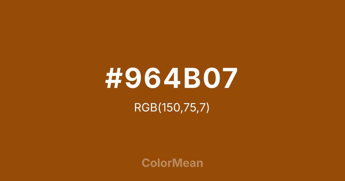 #964B07 RGB value is (150, 75, 7). The hex color red value is 150, green is 75, and blue is 7. Its HSL format shows a hue of 29°, saturation of 91 percent, and lightness of 31 percent. The CMYK process values are 0 percent, 50 percent, 95 percent, 41 percent.