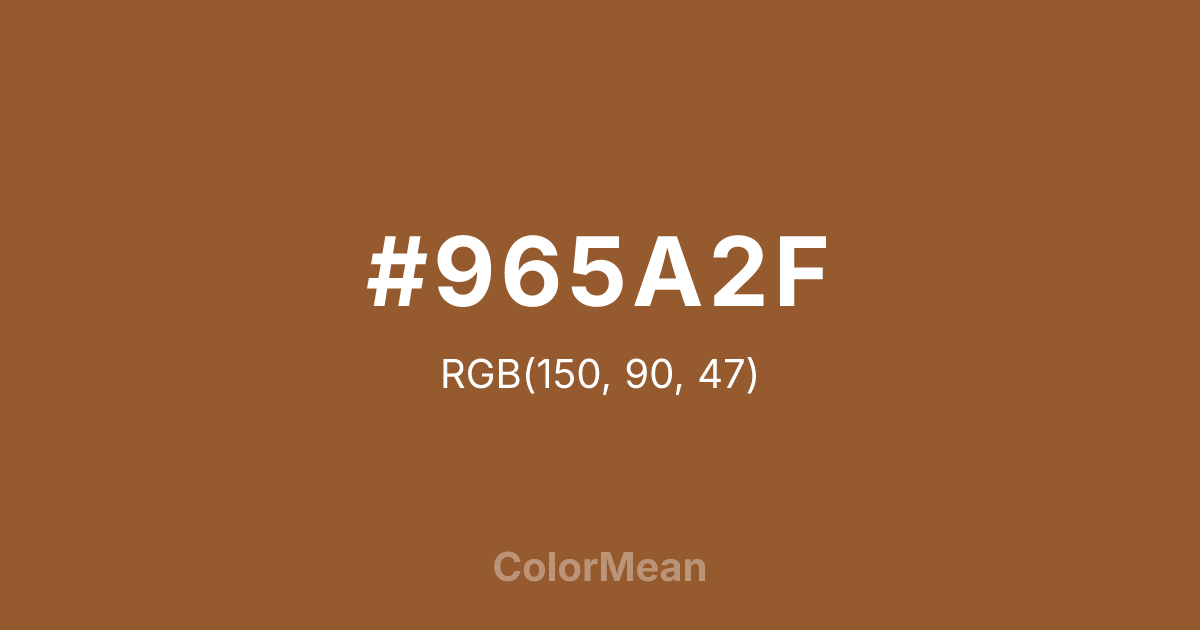 #965A2F RGB value is (150, 90, 47). The hex color red value is 150, green is 90, and blue is 47. Its HSL format shows a hue of 25°, saturation of 52 percent, and lightness of 39 percent. The CMYK process values are 0 percent, 40 percent, 69 percent, 41 percent.