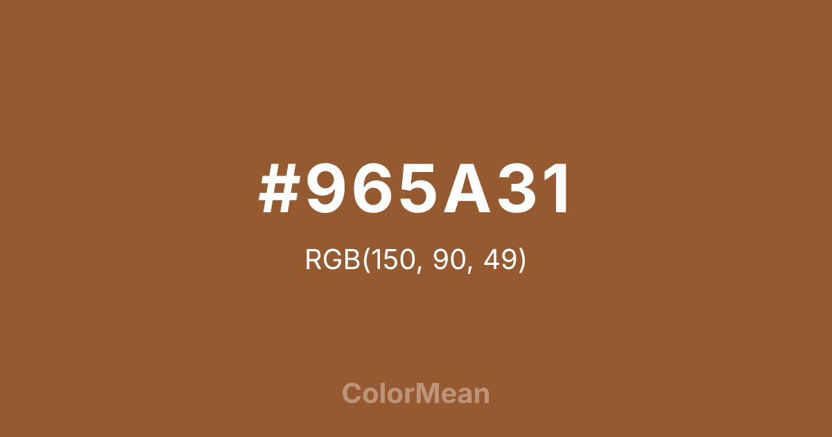 #965A31 RGB value is (150, 90, 49). The hex color red value is 150, green is 90, and blue is 49. Its HSL format shows a hue of 24°, saturation of 51 percent, and lightness of 39 percent. The CMYK process values are 0 percent, 40 percent, 67 percent, 41 percent.