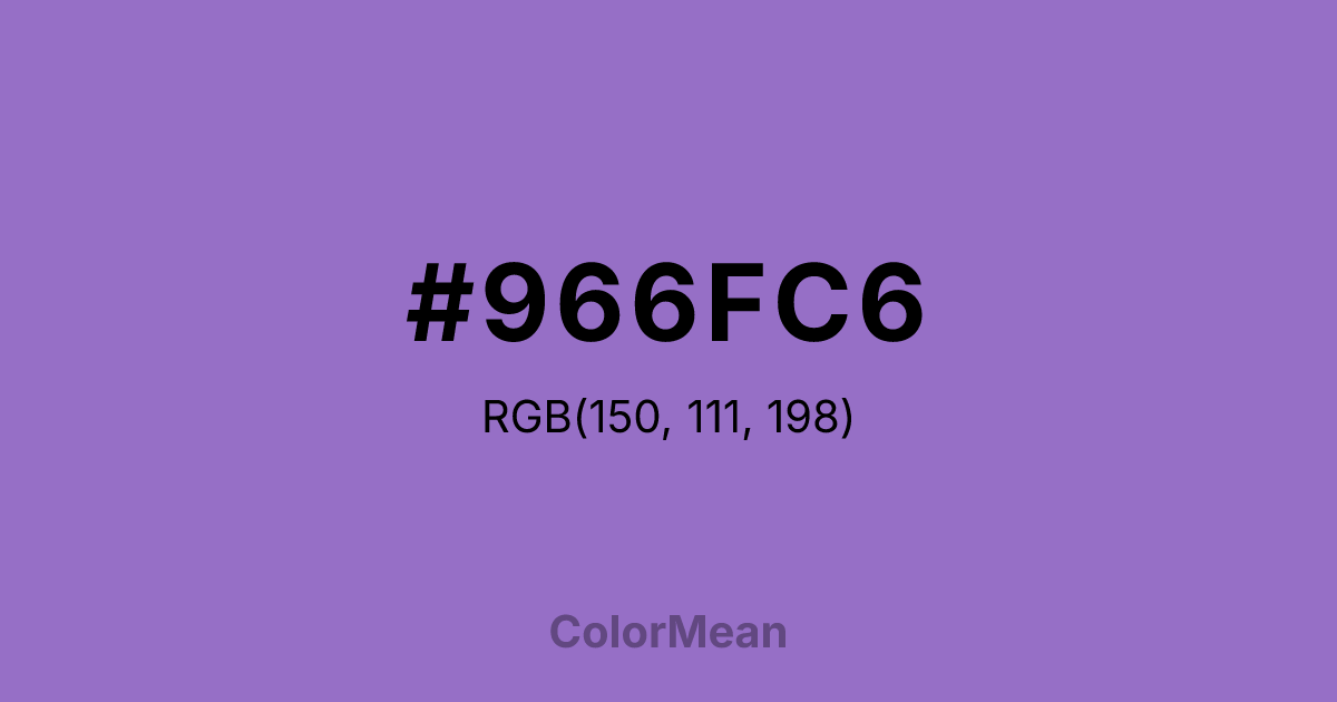 #966FC6 RGB value is (150, 111, 198). The hex color red value is 150, green is 111, and blue is 198. Its HSL format shows a hue of 267°, saturation of 43 percent, and lightness of 61 percent. The CMYK process values are 24 percent, 44 percent, 0 percent, 22 percent.