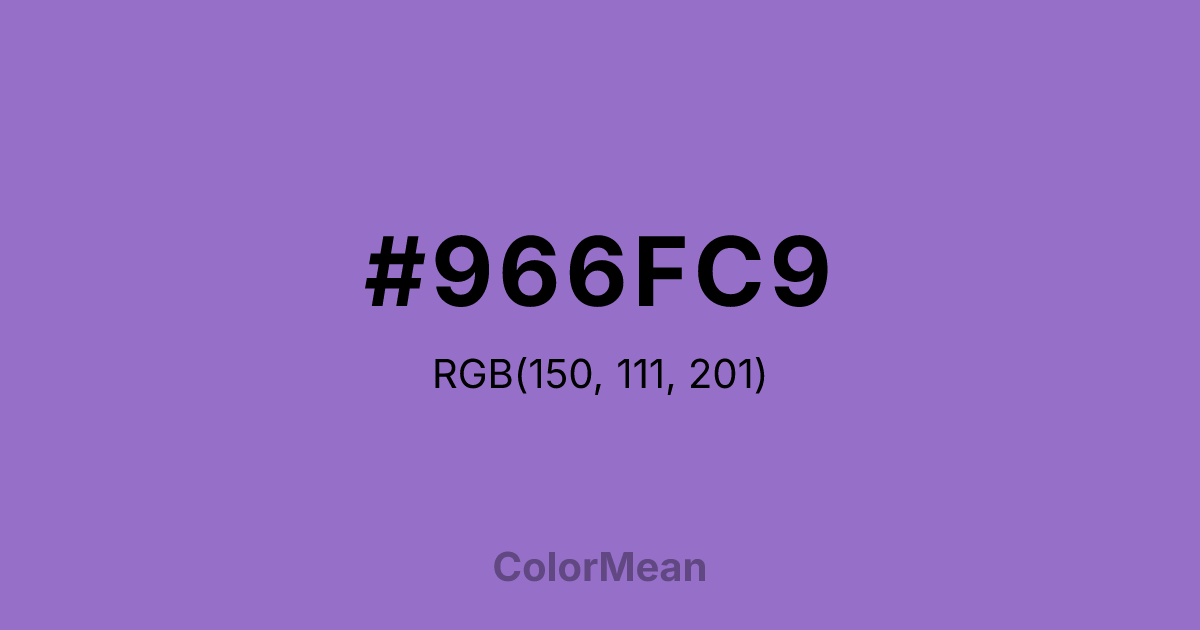 #966FC9 RGB value is (150, 111, 201). The hex color red value is 150, green is 111, and blue is 201. Its HSL format shows a hue of 266°, saturation of 45 percent, and lightness of 61 percent. The CMYK process values are 25 percent, 45 percent, 0 percent, 21 percent.
