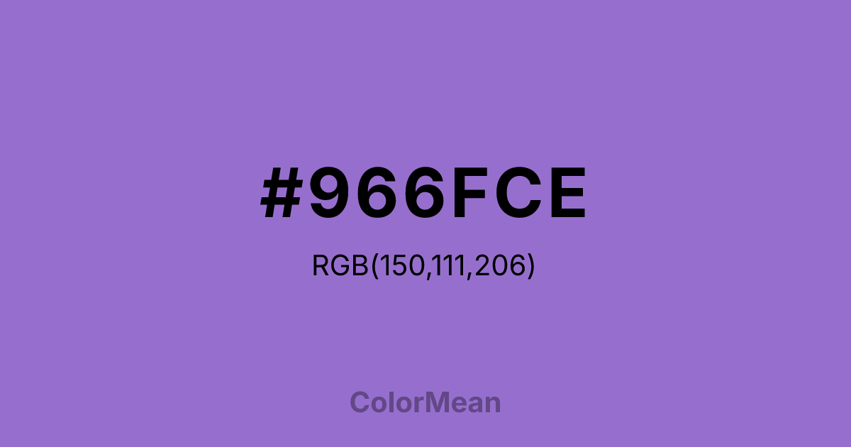 #966FCE RGB value is (150, 111, 206). The hex color red value is 150, green is 111, and blue is 206. Its HSL format shows a hue of 265°, saturation of 49 percent, and lightness of 62 percent. The CMYK process values are 27 percent, 46 percent, 0 percent, 19 percent.