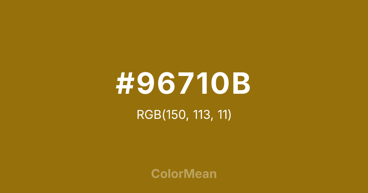 #96710B RGB value is (150, 113, 11). The hex color red value is 150, green is 113, and blue is 11. Its HSL format shows a hue of 44°, saturation of 86 percent, and lightness of 32 percent. The CMYK process values are 0 percent, 25 percent, 93 percent, 41 percent.
