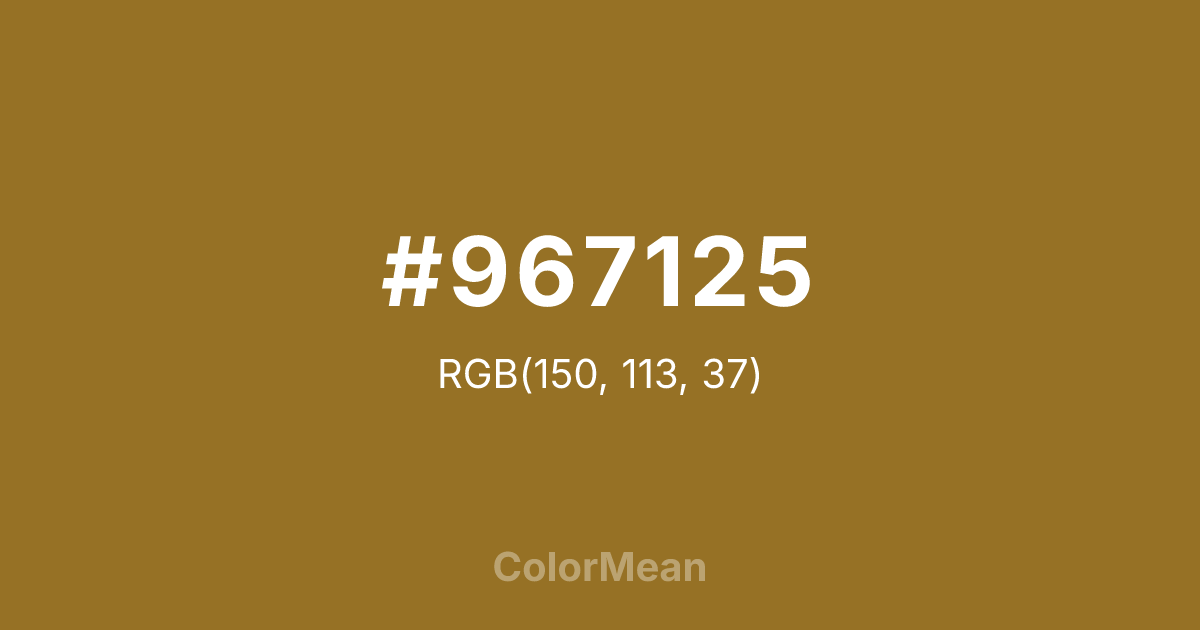 #967125 RGB value is (150, 113, 37). The hex color red value is 150, green is 113, and blue is 37. Its HSL format shows a hue of 40°, saturation of 60 percent, and lightness of 37 percent. The CMYK process values are 0 percent, 25 percent, 75 percent, 41 percent.
