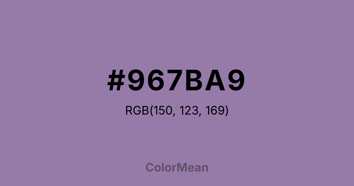 #967BA9 RGB value is (150, 123, 169). The hex color red value is 150, green is 123, and blue is 169. Its HSL format shows a hue of 275°, saturation of 21 percent, and lightness of 57 percent. The CMYK process values are 11 percent, 27 percent, 0 percent, 34 percent.