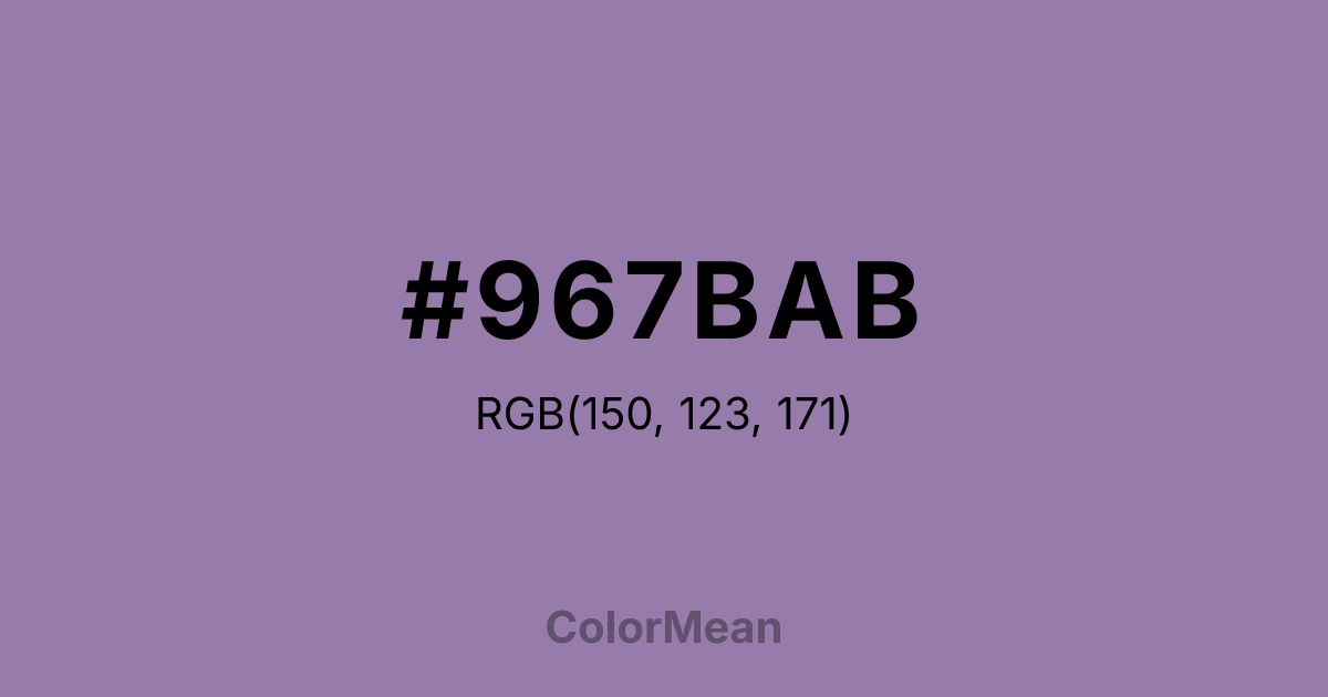 #967BAB RGB value is (150, 123, 171). The hex color red value is 150, green is 123, and blue is 171. Its HSL format shows a hue of 274°, saturation of 22 percent, and lightness of 58 percent. The CMYK process values are 12 percent, 28 percent, 0 percent, 33 percent.