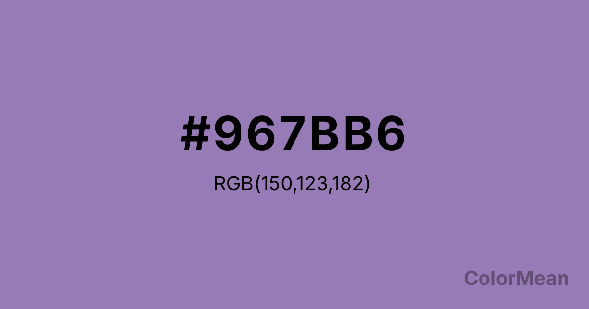 Lavender Purple (#967BB6) RGB value is (150, 123, 182). The hex color red value is 150, green is 123, and blue is 182. Its HSL format shows a hue of 267°, saturation of 29 percent, and lightness of 60 percent. The CMYK process values are 18 percent, 32 percent, 0 percent, 29 percent.