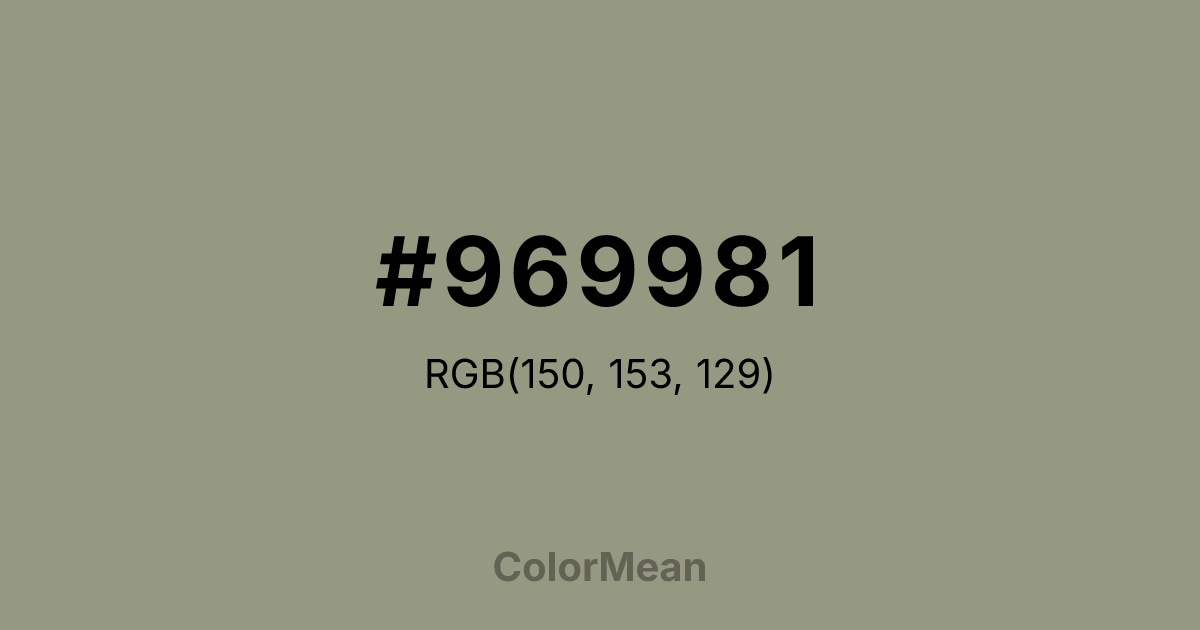 #969981 RGB value is (150, 153, 129). The hex color red value is 150, green is 153, and blue is 129. Its HSL format shows a hue of 67°, saturation of 11 percent, and lightness of 55 percent. The CMYK process values are 2 percent, 0 percent, 16 percent, 40 percent.