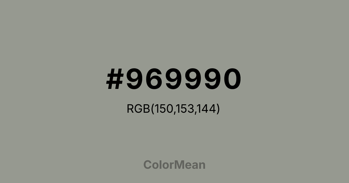 #969990 RGB value is (150, 153, 144). The hex color red value is 150, green is 153, and blue is 144. Its HSL format shows a hue of 80°, saturation of 4 percent, and lightness of 58 percent. The CMYK process values are 2 percent, 0 percent, 6 percent, 40 percent.