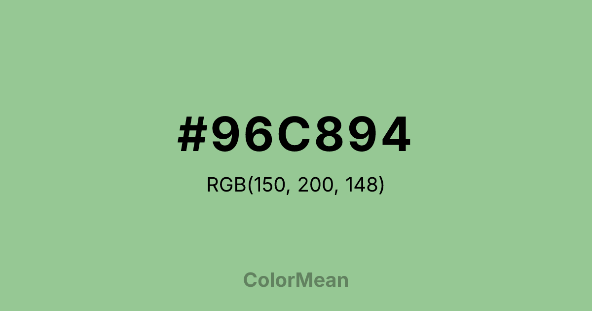 #96C894 RGB value is (150, 200, 148). The hex color red value is 150, green is 200, and blue is 148. Its HSL format shows a hue of 118°, saturation of 32 percent, and lightness of 68 percent. The CMYK process values are 25 percent, 0 percent, 26 percent, 22 percent.