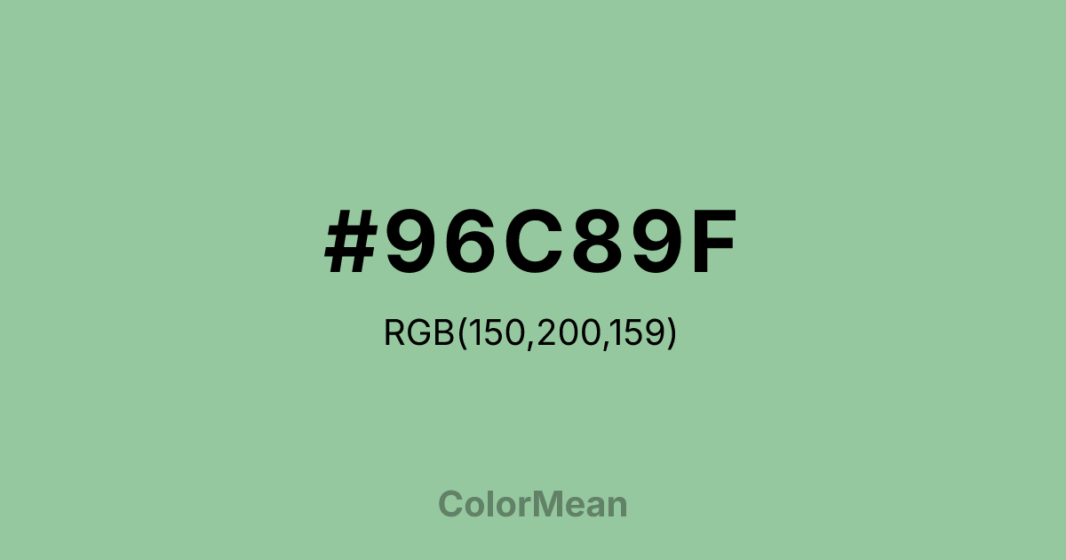 #96C89F RGB value is (150, 200, 159). The hex color red value is 150, green is 200, and blue is 159. Its HSL format shows a hue of 131°, saturation of 31 percent, and lightness of 69 percent. The CMYK process values are 25 percent, 0 percent, 21 percent, 22 percent.