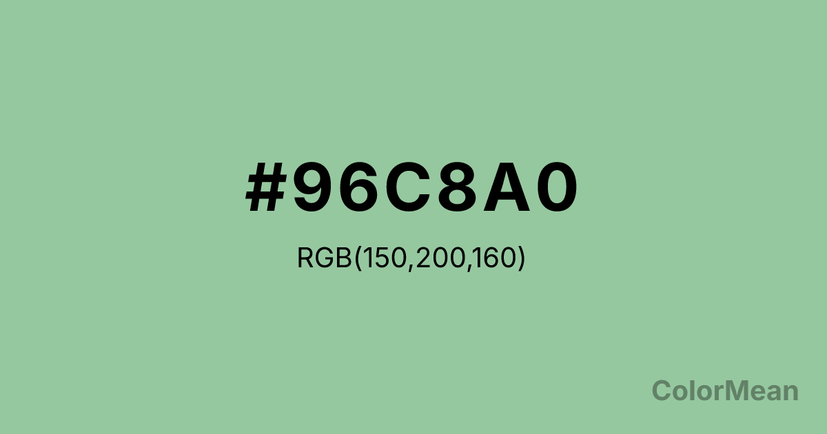 #96C8A0 RGB value is (150, 200, 160). The hex color red value is 150, green is 200, and blue is 160. Its HSL format shows a hue of 132°, saturation of 31 percent, and lightness of 69 percent. The CMYK process values are 25 percent, 0 percent, 20 percent, 22 percent.
