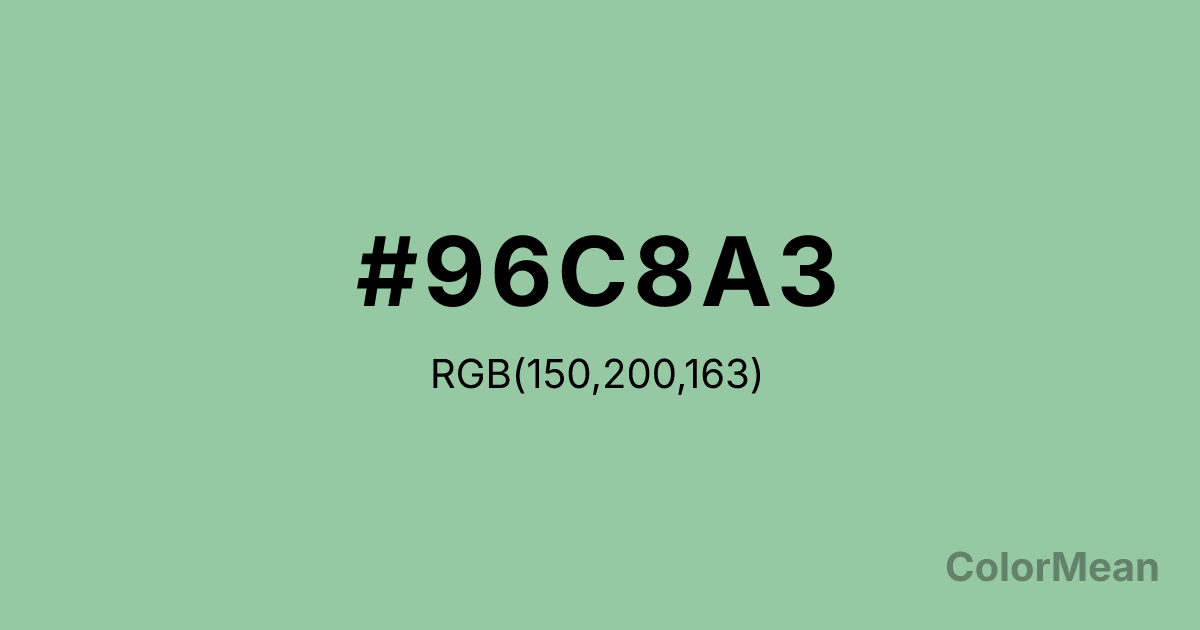 #96C8A3 RGB value is (150, 200, 163). The hex color red value is 150, green is 200, and blue is 163. Its HSL format shows a hue of 136°, saturation of 31 percent, and lightness of 69 percent. The CMYK process values are 25 percent, 0 percent, 19 percent, 22 percent.