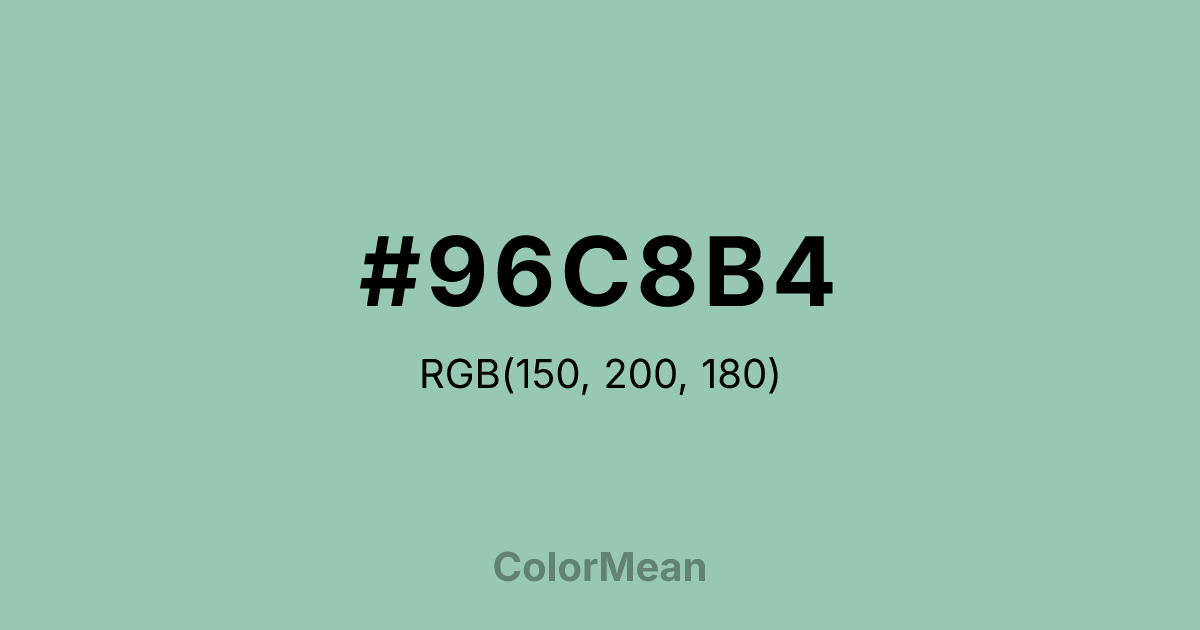 #96C8B4 RGB value is (150, 200, 180). The hex color red value is 150, green is 200, and blue is 180. Its HSL format shows a hue of 156°, saturation of 31 percent, and lightness of 69 percent. The CMYK process values are 25 percent, 0 percent, 10 percent, 22 percent.