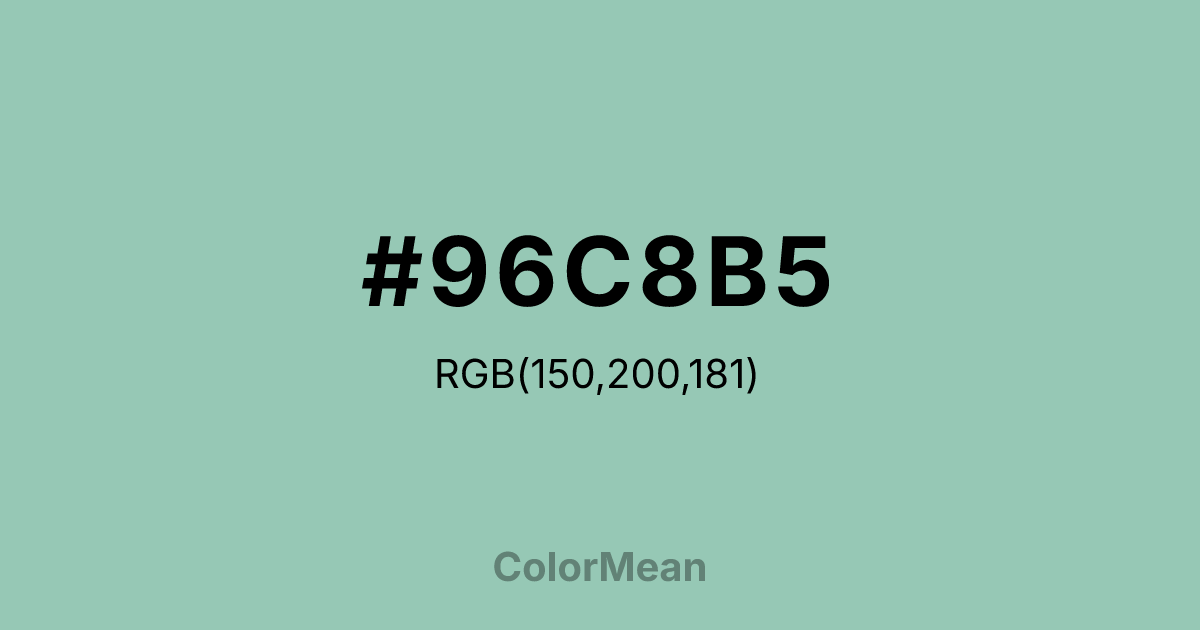 #96C8B5 RGB value is (150, 200, 181). The hex color red value is 150, green is 200, and blue is 181. Its HSL format shows a hue of 157°, saturation of 31 percent, and lightness of 69 percent. The CMYK process values are 25 percent, 0 percent, 9 percent, 22 percent.