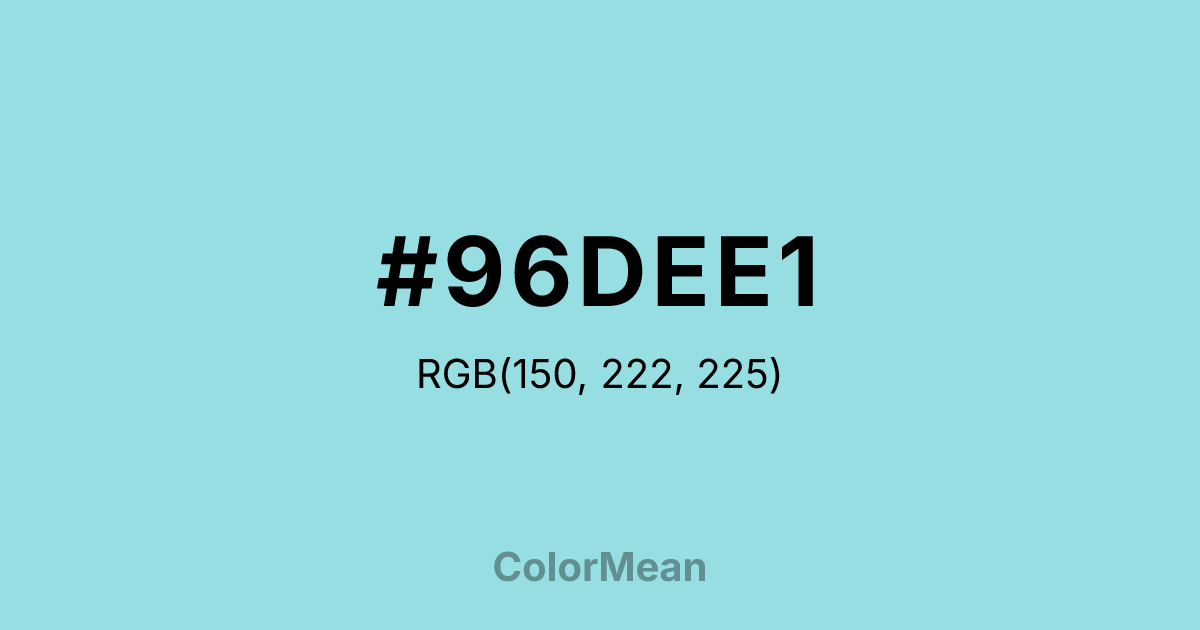 #96DEE1 RGB value is (150, 222, 225). The hex color red value is 150, green is 222, and blue is 225. Its HSL format shows a hue of 182°, saturation of 56 percent, and lightness of 74 percent. The CMYK process values are 33 percent, 1 percent, 0 percent, 12 percent.