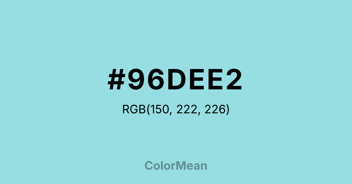 #96DEE2 RGB value is (150, 222, 226). The hex color red value is 150, green is 222, and blue is 226. Its HSL format shows a hue of 183°, saturation of 57 percent, and lightness of 74 percent. The CMYK process values are 34 percent, 2 percent, 0 percent, 11 percent.