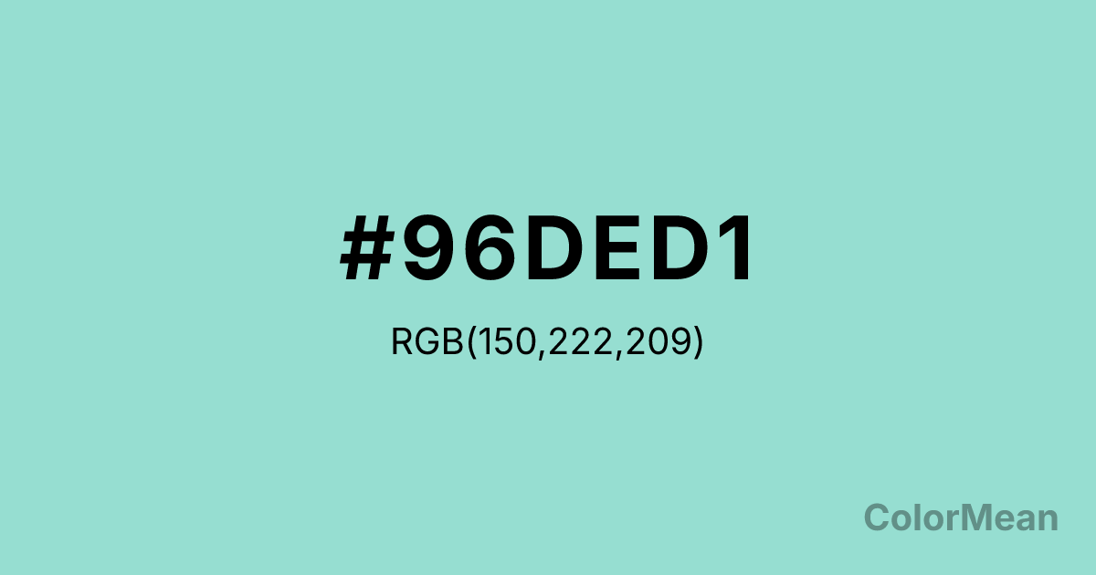 Pale Robin Egg Blue (#96DED1) RGB value is (150, 222, 209). The hex color red value is 150, green is 222, and blue is 209. Its HSL format shows a hue of 169°, saturation of 52 percent, and lightness of 73 percent. The CMYK process values are 32 percent, 0 percent, 6 percent, 13 percent.