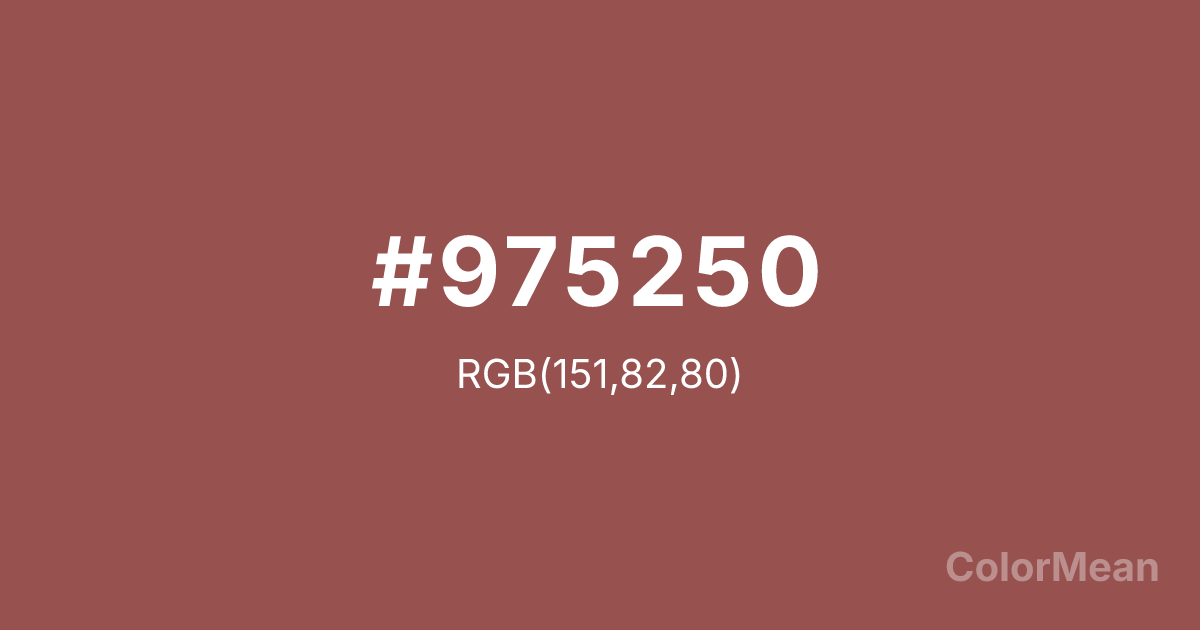 Marsala (#975250) RGB value is (151, 82, 80). The hex color red value is 151, green is 82, and blue is 80. Its HSL format shows a hue of 2°, saturation of 31 percent, and lightness of 45 percent. The CMYK process values are 0 percent, 46 percent, 47 percent, 41 percent.