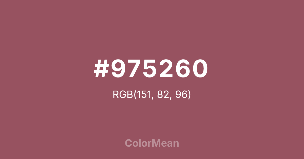 #975260 RGB value is (151, 82, 96). The hex color red value is 151, green is 82, and blue is 96. Its HSL format shows a hue of 348°, saturation of 30 percent, and lightness of 46 percent. The CMYK process values are 0 percent, 46 percent, 36 percent, 41 percent.