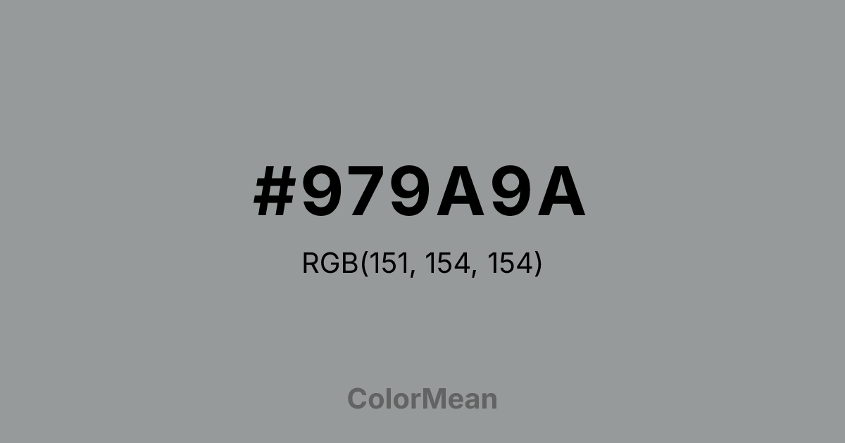 #979A9A RGB value is (151, 154, 154). The hex color red value is 151, green is 154, and blue is 154. Its HSL format shows a hue of 180°, saturation of 1 percent, and lightness of 60 percent. The CMYK process values are 2 percent, 0 percent, 0 percent, 40 percent.