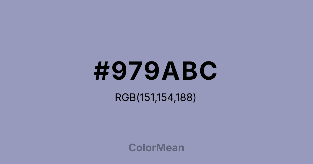 #979ABC RGB value is (151, 154, 188). The hex color red value is 151, green is 154, and blue is 188. Its HSL format shows a hue of 235°, saturation of 22 percent, and lightness of 66 percent. The CMYK process values are 20 percent, 18 percent, 0 percent, 26 percent.