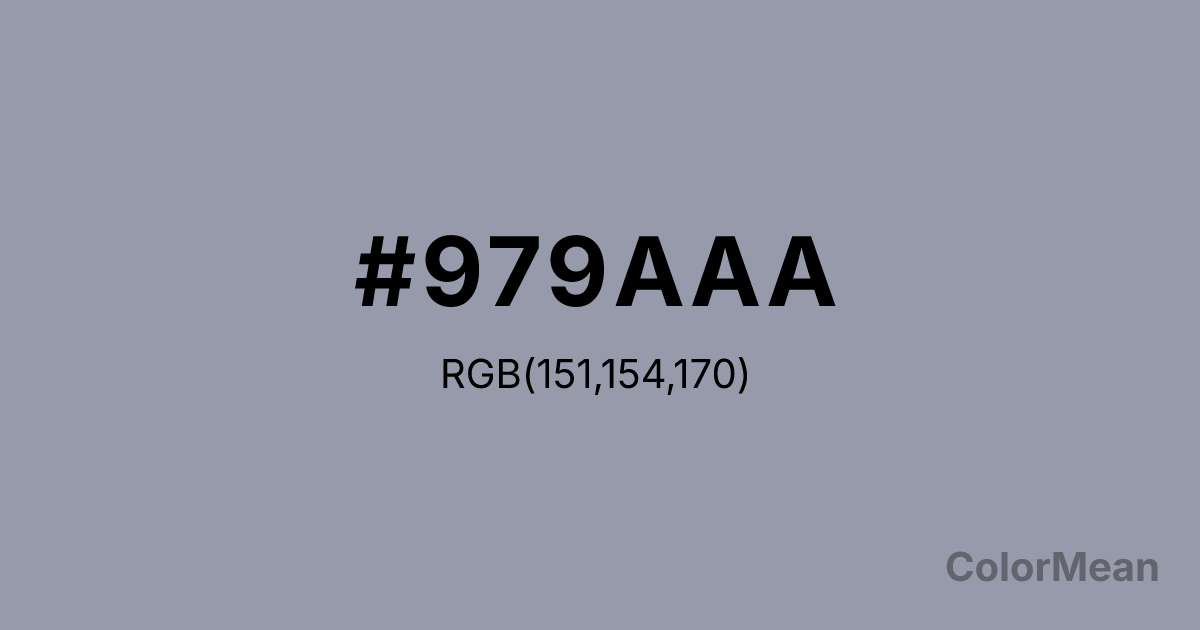 Manatee (#979AAA) RGB value is (151, 154, 170). The hex color red value is 151, green is 154, and blue is 170. Its HSL format shows a hue of 231°, saturation of 10 percent, and lightness of 63 percent. The CMYK process values are 11 percent, 9 percent, 0 percent, 33 percent.