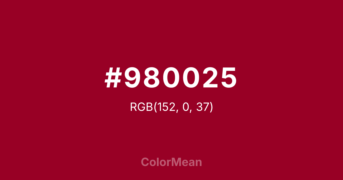 #980025 RGB value is (152, 0, 37). The hex color red value is 152, green is 0, and blue is 37. Its HSL format shows a hue of 345°, saturation of 100 percent, and lightness of 30 percent. The CMYK process values are 0 percent, 100 percent, 76 percent, 40 percent.