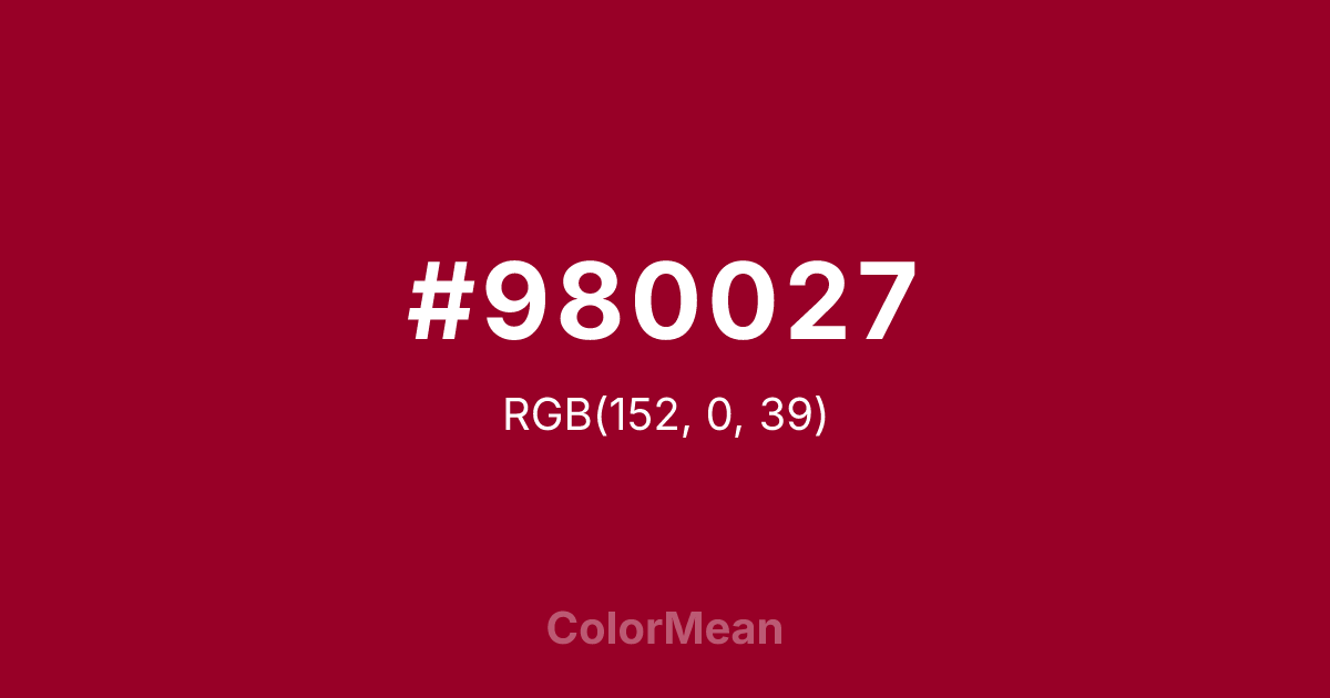 #980027 RGB value is (152, 0, 39). The hex color red value is 152, green is 0, and blue is 39. Its HSL format shows a hue of 345°, saturation of 100 percent, and lightness of 30 percent. The CMYK process values are 0 percent, 100 percent, 74 percent, 40 percent.