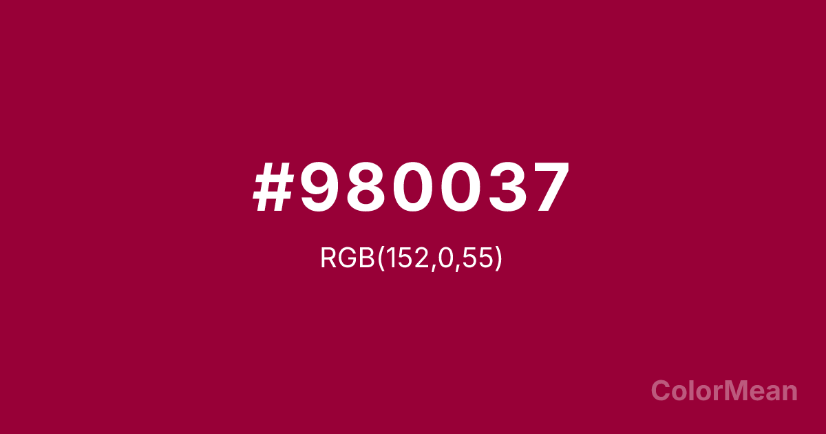 #980037 RGB value is (152, 0, 55). The hex color red value is 152, green is 0, and blue is 55. Its HSL format shows a hue of 338°, saturation of 100 percent, and lightness of 30 percent. The CMYK process values are 0 percent, 100 percent, 64 percent, 40 percent.
