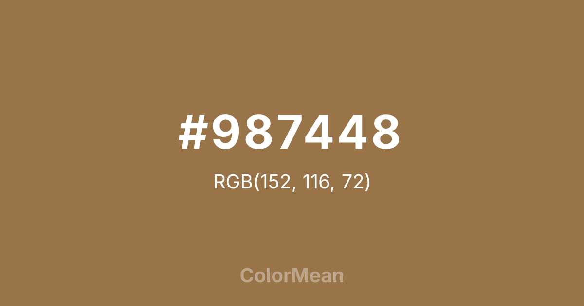 #987448 RGB value is (152, 116, 72). The hex color red value is 152, green is 116, and blue is 72. Its HSL format shows a hue of 33°, saturation of 36 percent, and lightness of 44 percent. The CMYK process values are 0 percent, 24 percent, 53 percent, 40 percent.