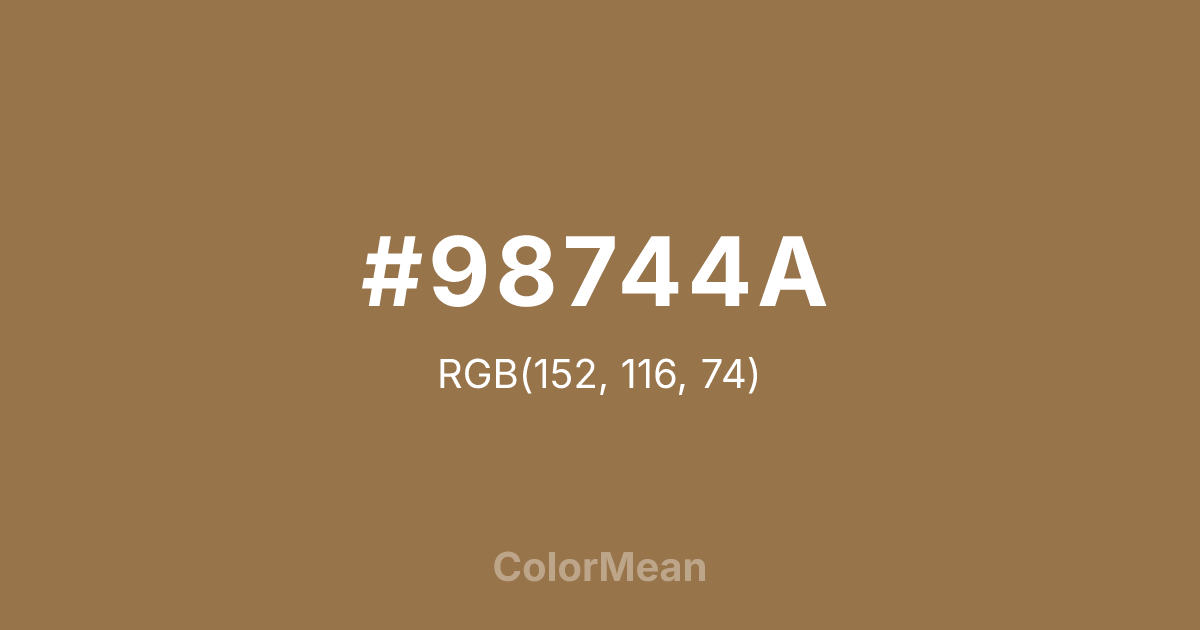 #98744A RGB value is (152, 116, 74). The hex color red value is 152, green is 116, and blue is 74. Its HSL format shows a hue of 32°, saturation of 35 percent, and lightness of 44 percent. The CMYK process values are 0 percent, 24 percent, 51 percent, 40 percent.
