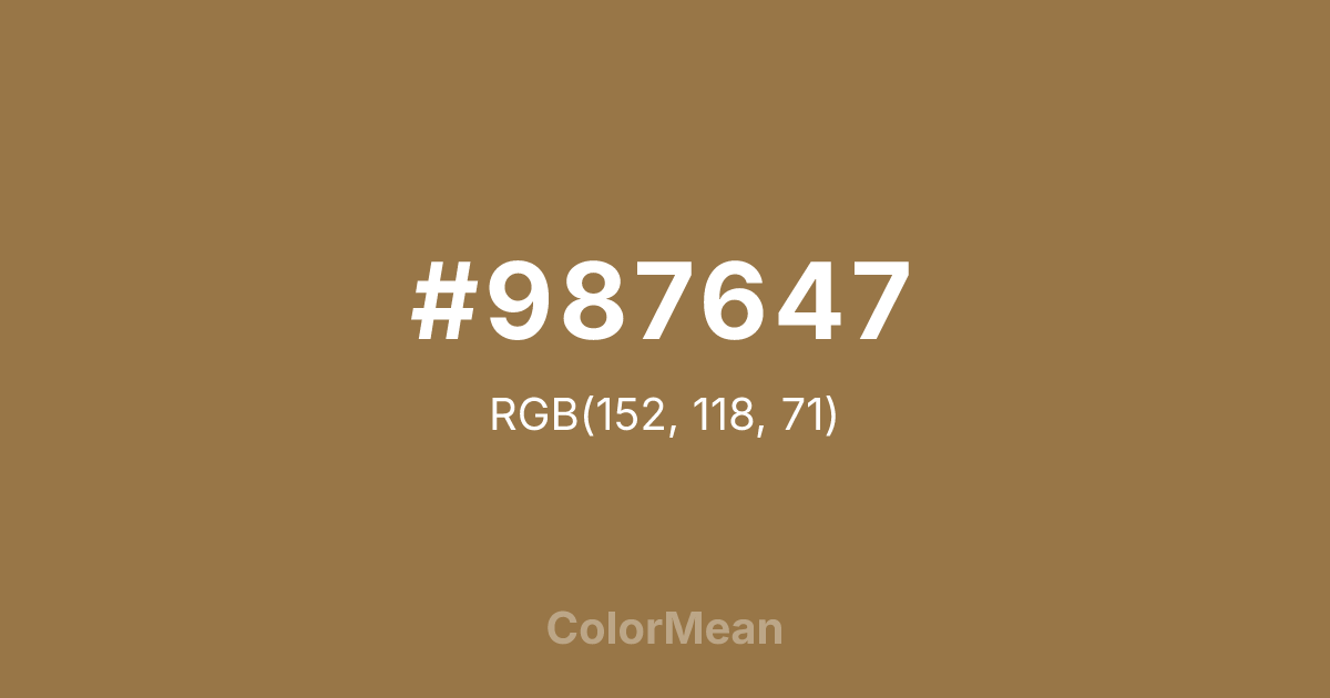 #987647 RGB value is (152, 118, 71). The hex color red value is 152, green is 118, and blue is 71. Its HSL format shows a hue of 35°, saturation of 36 percent, and lightness of 44 percent. The CMYK process values are 0 percent, 22 percent, 53 percent, 40 percent.