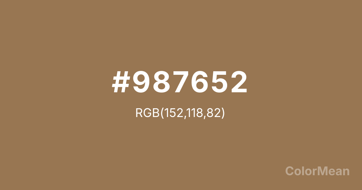 #987652 RGB value is (152, 118, 82). The hex color red value is 152, green is 118, and blue is 82. Its HSL format shows a hue of 31°, saturation of 30 percent, and lightness of 46 percent. The CMYK process values are 0 percent, 22 percent, 46 percent, 40 percent.