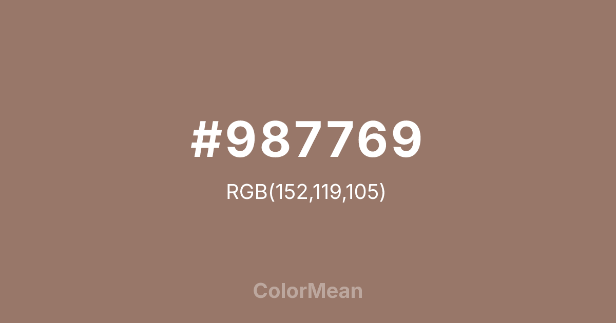 #987769 RGB value is (152, 119, 105). The hex color red value is 152, green is 119, and blue is 105. Its HSL format shows a hue of 18°, saturation of 19 percent, and lightness of 50 percent. The CMYK process values are 0 percent, 22 percent, 31 percent, 40 percent.