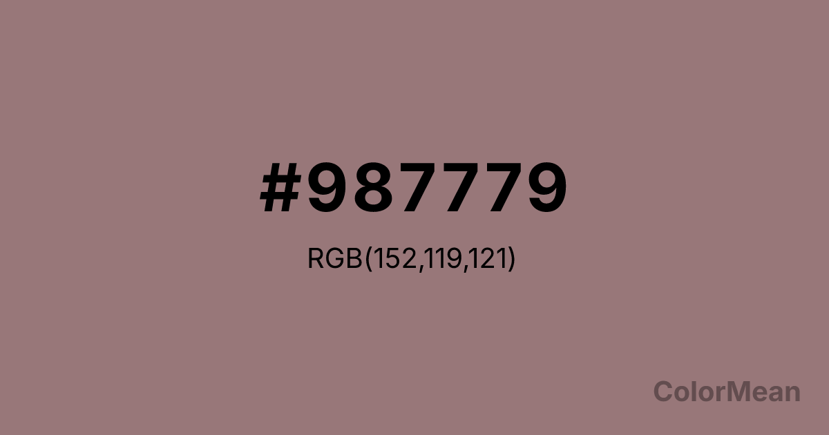 #987779 RGB value is (152, 119, 121). The hex color red value is 152, green is 119, and blue is 121. Its HSL format shows a hue of 356°, saturation of 14 percent, and lightness of 53 percent. The CMYK process values are 0 percent, 22 percent, 20 percent, 40 percent.