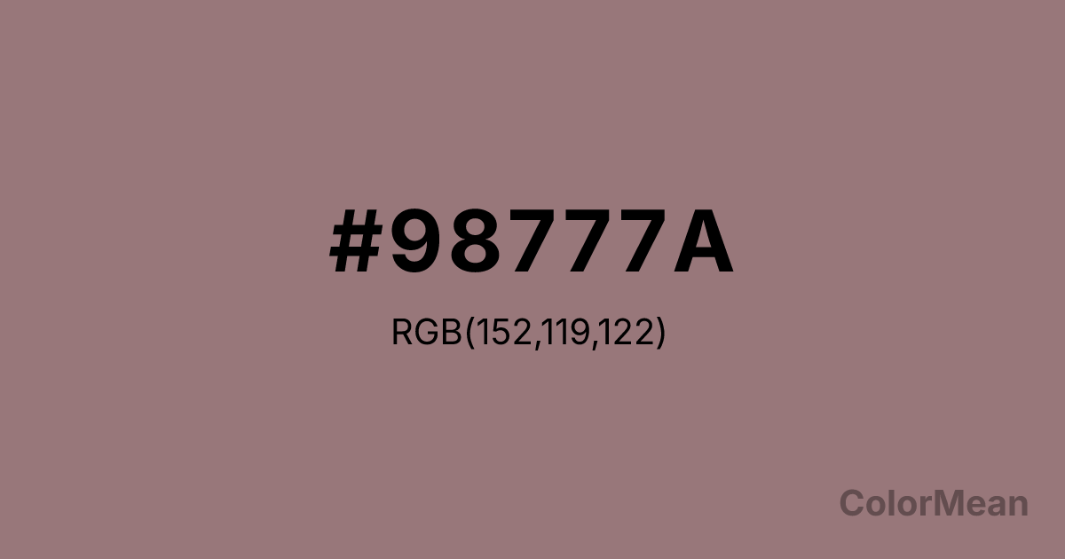 #98777A RGB value is (152, 119, 122). The hex color red value is 152, green is 119, and blue is 122. Its HSL format shows a hue of 355°, saturation of 14 percent, and lightness of 53 percent. The CMYK process values are 0 percent, 22 percent, 20 percent, 40 percent.