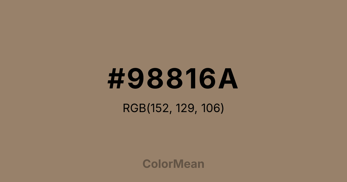 #98816A RGB value is (152, 129, 106). The hex color red value is 152, green is 129, and blue is 106. Its HSL format shows a hue of 30°, saturation of 18 percent, and lightness of 51 percent. The CMYK process values are 0 percent, 15 percent, 30 percent, 40 percent.