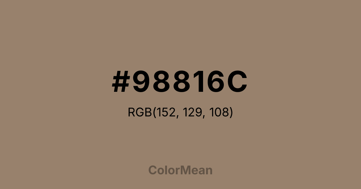 #98816C RGB value is (152, 129, 108). The hex color red value is 152, green is 129, and blue is 108. Its HSL format shows a hue of 29°, saturation of 18 percent, and lightness of 51 percent. The CMYK process values are 0 percent, 15 percent, 29 percent, 40 percent.
