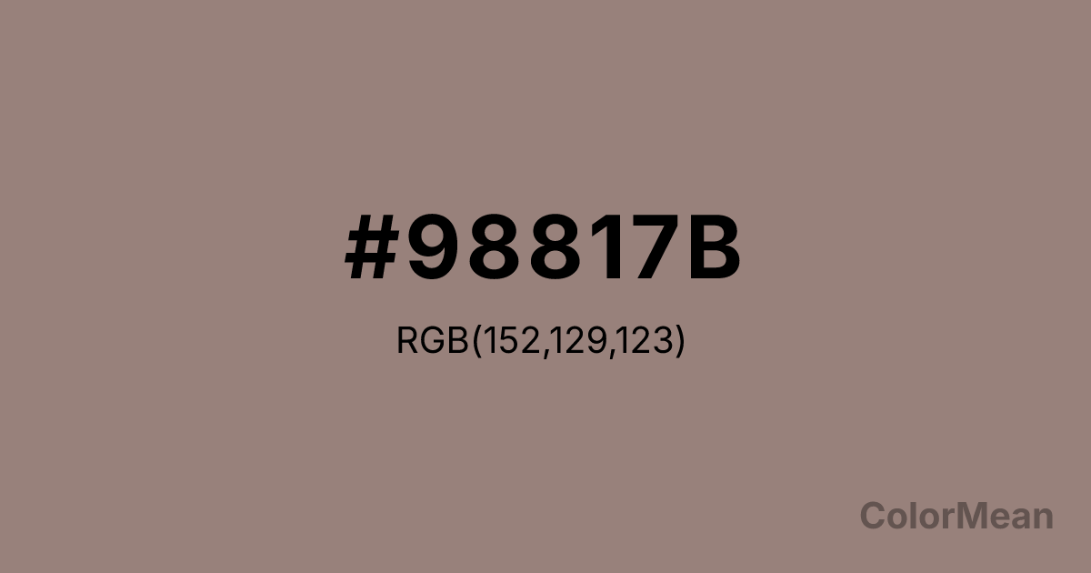 Cinereous (#98817B) RGB value is (152, 129, 123). The hex color red value is 152, green is 129, and blue is 123. Its HSL format shows a hue of 12°, saturation of 12 percent, and lightness of 54 percent. The CMYK process values are 0 percent, 15 percent, 19 percent, 40 percent.