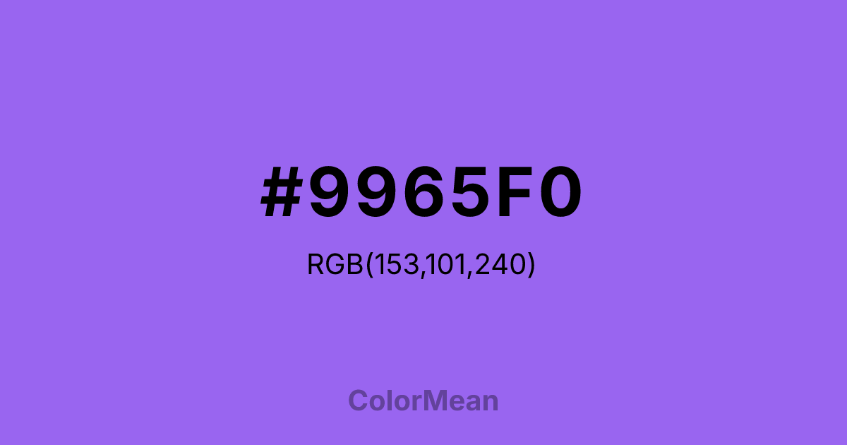 #9965F0 RGB value is (153, 101, 240). The hex color red value is 153, green is 101, and blue is 240. Its HSL format shows a hue of 262°, saturation of 82 percent, and lightness of 67 percent. The CMYK process values are 36 percent, 58 percent, 0 percent, 6 percent.
