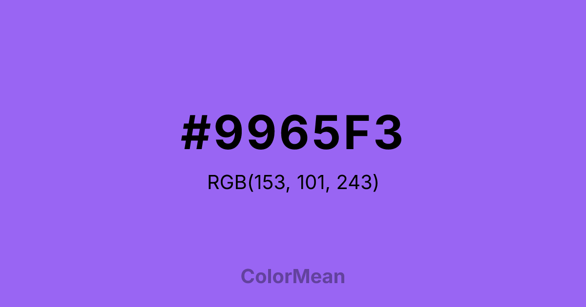#9965F3 RGB value is (153, 101, 243). The hex color red value is 153, green is 101, and blue is 243. Its HSL format shows a hue of 262°, saturation of 86 percent, and lightness of 67 percent. The CMYK process values are 37 percent, 58 percent, 0 percent, 5 percent.