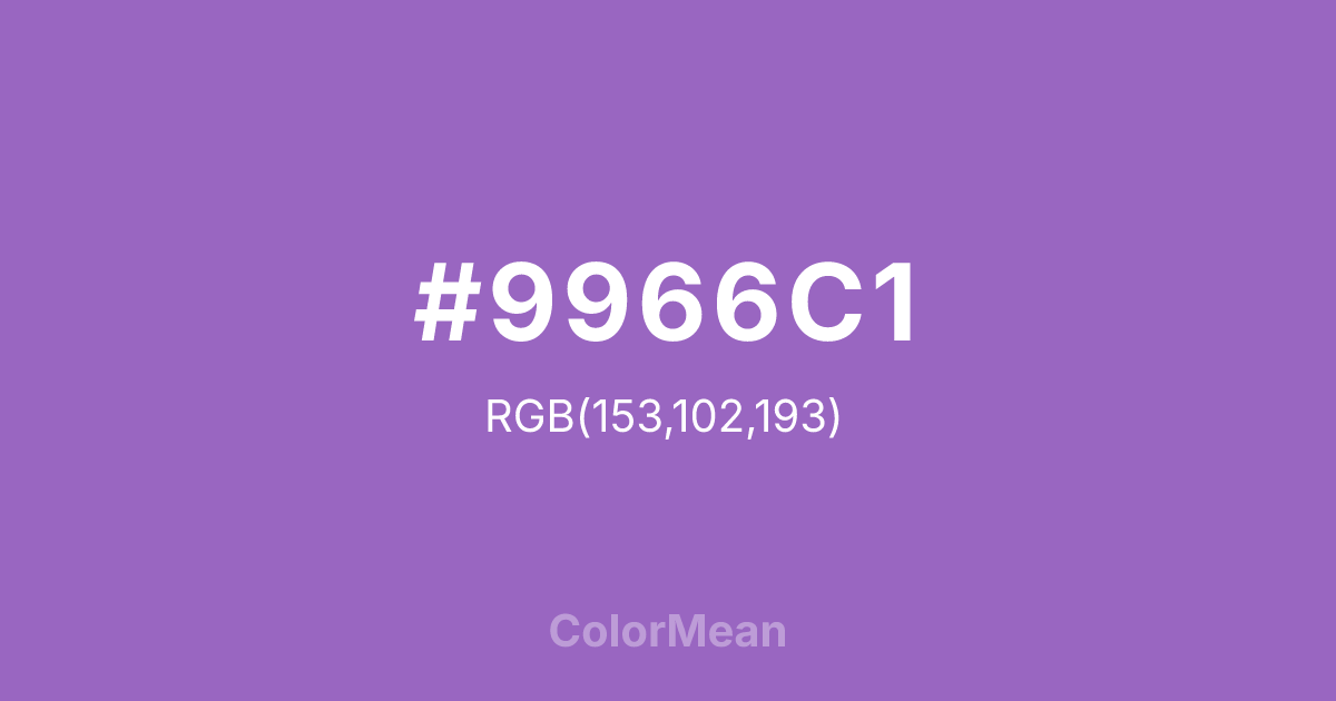 #9966C1 RGB value is (153, 102, 193). The hex color red value is 153, green is 102, and blue is 193. Its HSL format shows a hue of 274°, saturation of 42 percent, and lightness of 58 percent. The CMYK process values are 21 percent, 47 percent, 0 percent, 24 percent.