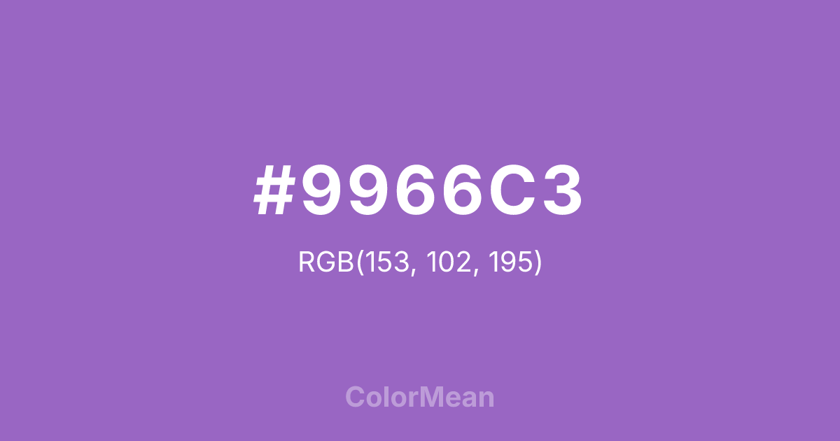 #9966C3 RGB value is (153, 102, 195). The hex color red value is 153, green is 102, and blue is 195. Its HSL format shows a hue of 273°, saturation of 44 percent, and lightness of 58 percent. The CMYK process values are 22 percent, 48 percent, 0 percent, 24 percent.